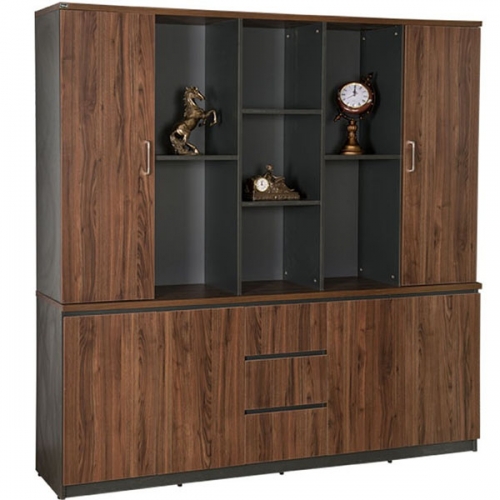Tủ tài liệu giám đốc chia làm 2 khoang lớn: khoang trên là 2 cánh gỗ mở dài có tay nắm mạ và các đợt trống để tài liệu, trưng bày văn phòng phẩm; khoang dưới là các ngăn kéo và cánh gỗ mở tay nắm âm.